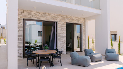 Each villa features 225 m² of internal covered area with 4 spacious bedrooms and 3 elegant bathrooms, designed to maximize natural light and create open, comfortable living spaces. The bright living and dining areas flow seamlessly into the outdoor terraces, ideal for entertaining or relaxing under the Cyprus sun.